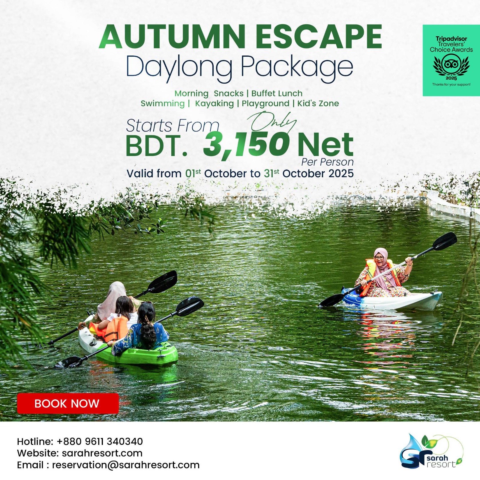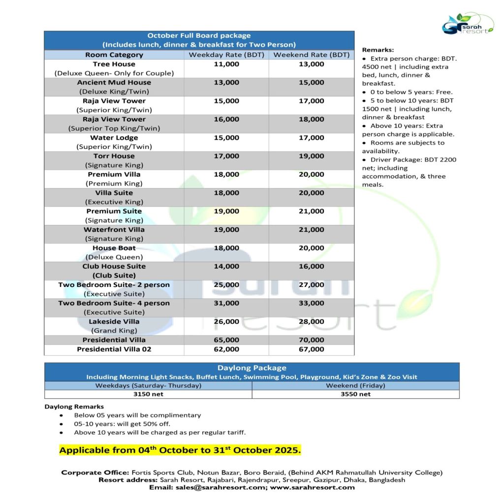 Package starting from only BDT 11000 NET for two person! Buffet Lunch, Dinner & Breakfast Swimming | Kayaking Kids’ Zone & Playground Valid from 04th to 30th October 2025 Sarah Resort, Gazipur